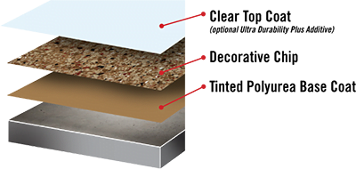 A UV stable polyaspartic topcoat seals the system, protecting against chemical exposure, moisture, impact, and daily abrasion.